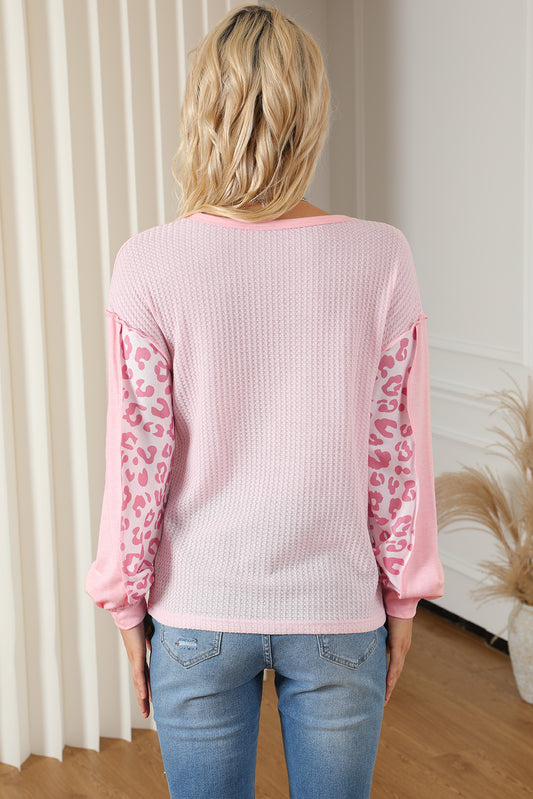 Pink Leopard Patchwork Exposed Seam Waffle Knit Top