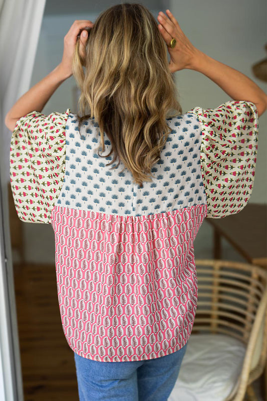 Red Floral Colorblock Flutter Cape Style Sleeves Blouse