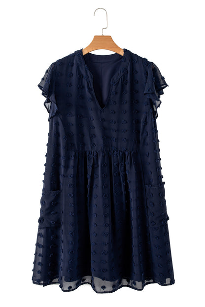 Navy Blue Dotty Textured Notched Neck Plus Ruffled Dress